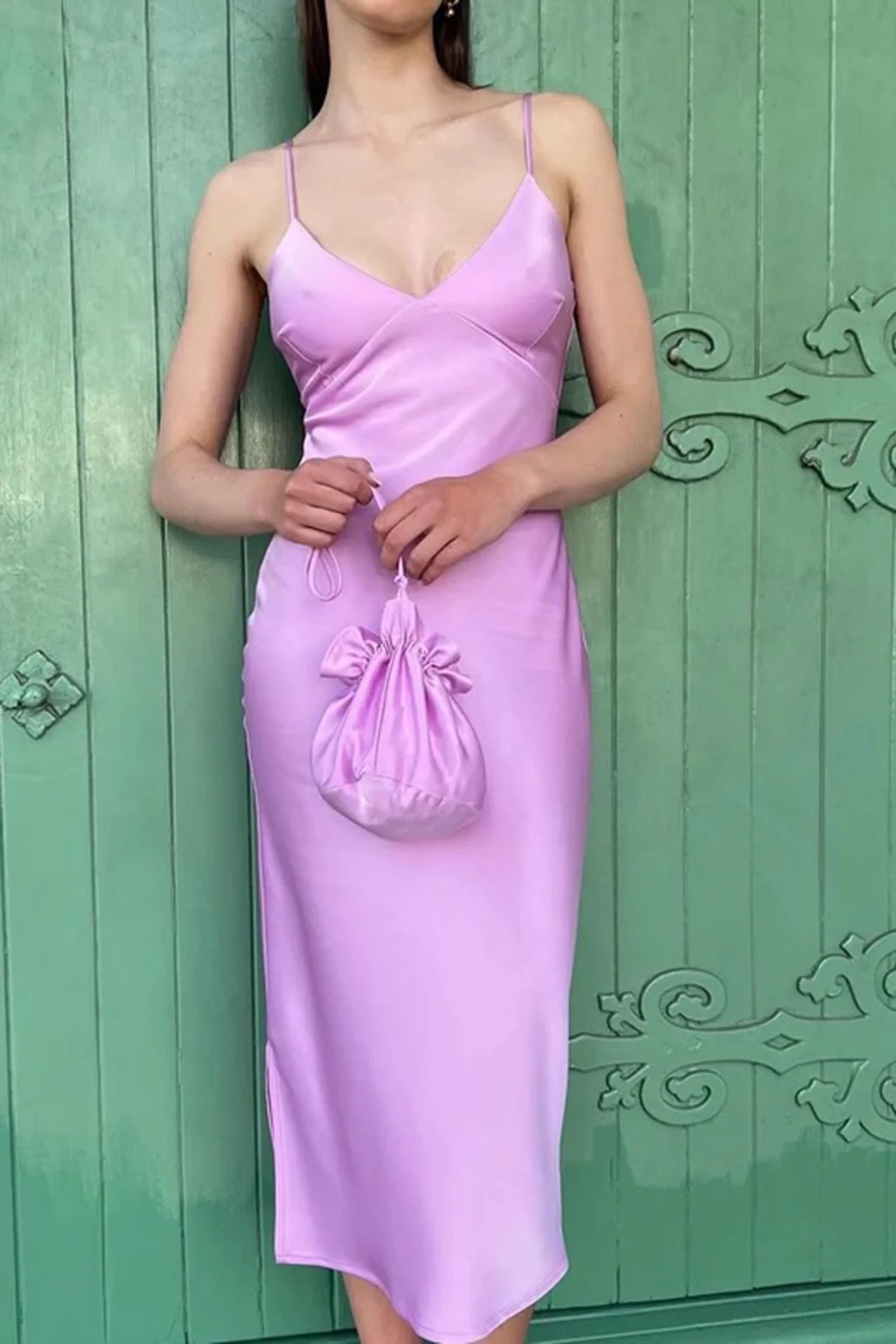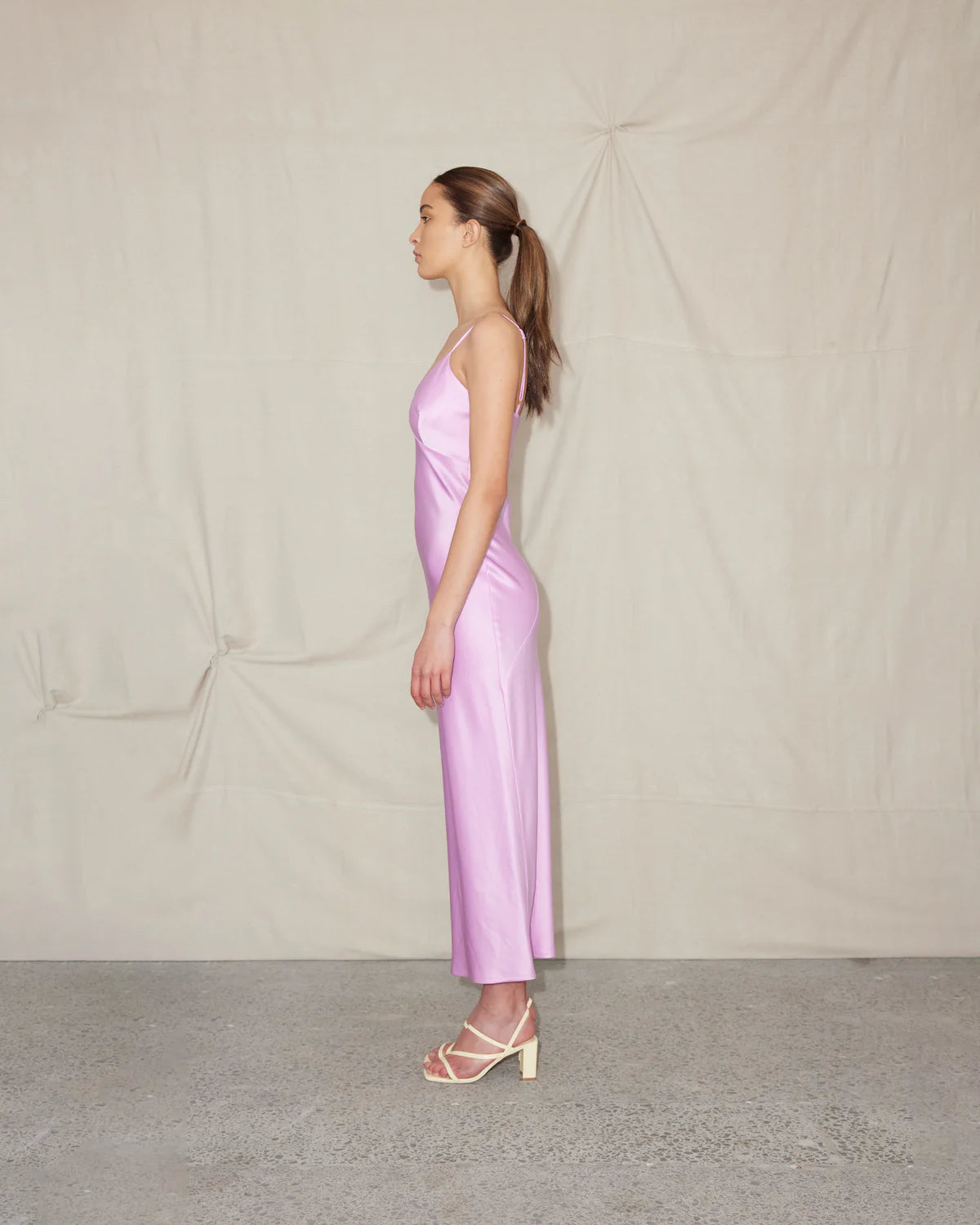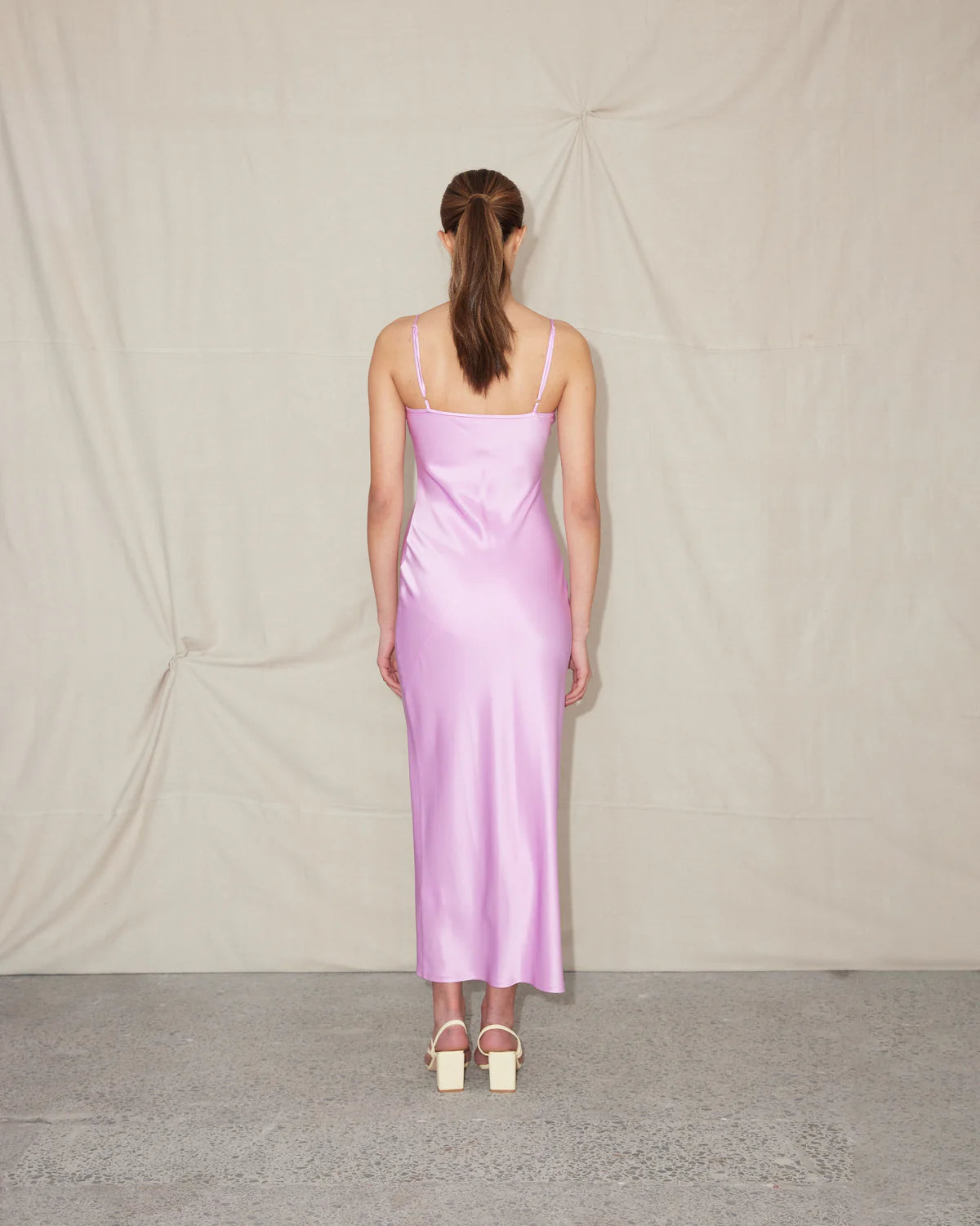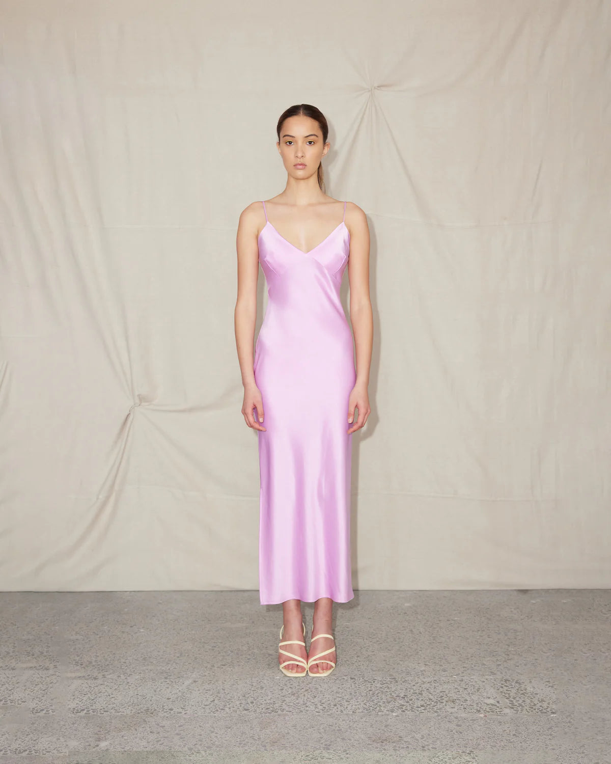 Iconic bias cut slip dress with plunging neckline in a new longer length. A wardrobe staple in heavy weight double satin that is lush to wear, in a sheeny jem colour.