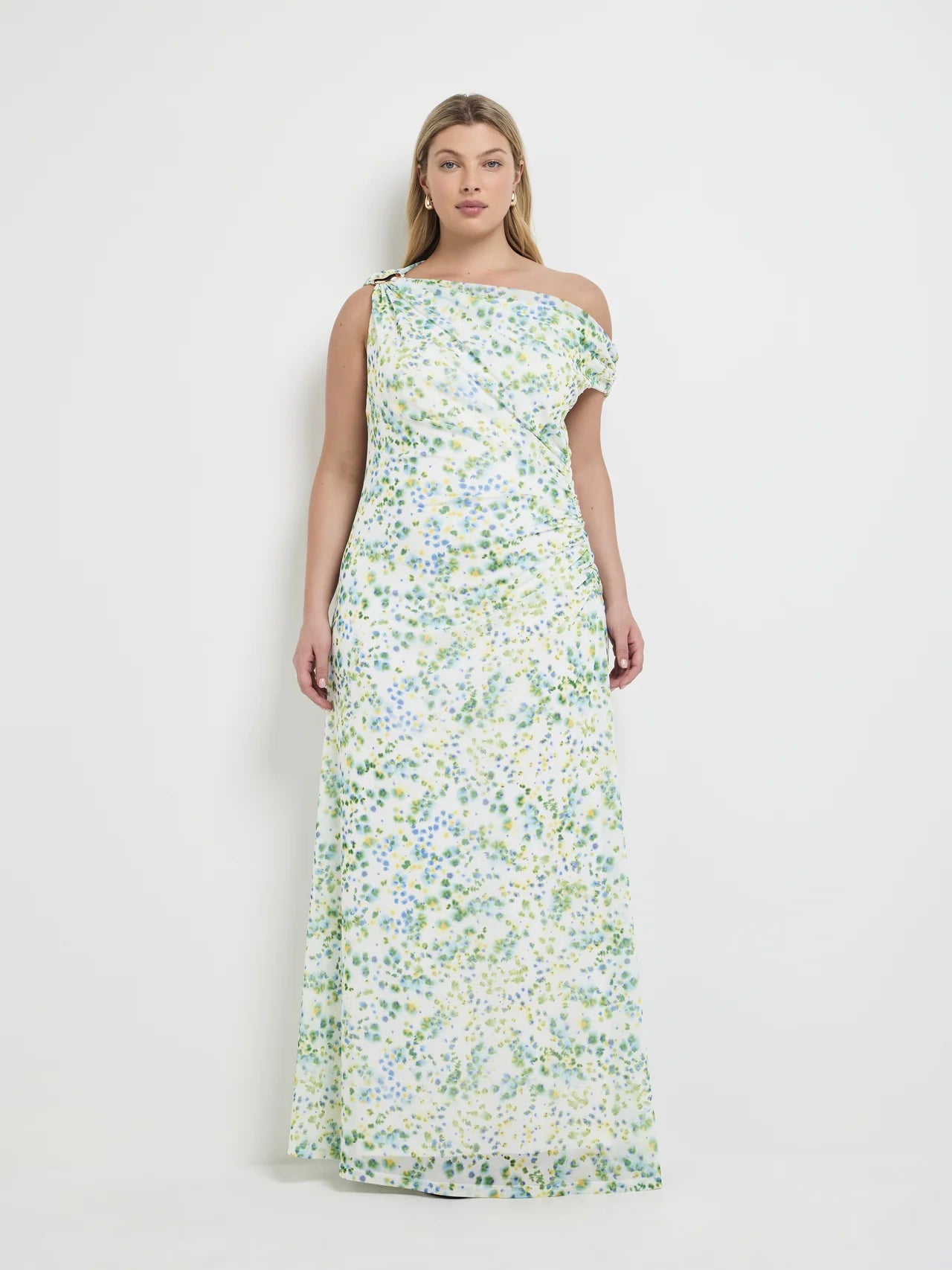 Effortless Romance - Introducing the Lily Mesh Dress. Featuring stretch floral print mesh fabrication, asymmetrical off shoulder neckline with gold hardware, fitted styling, gathering at bodice and hip and maxi skirt length