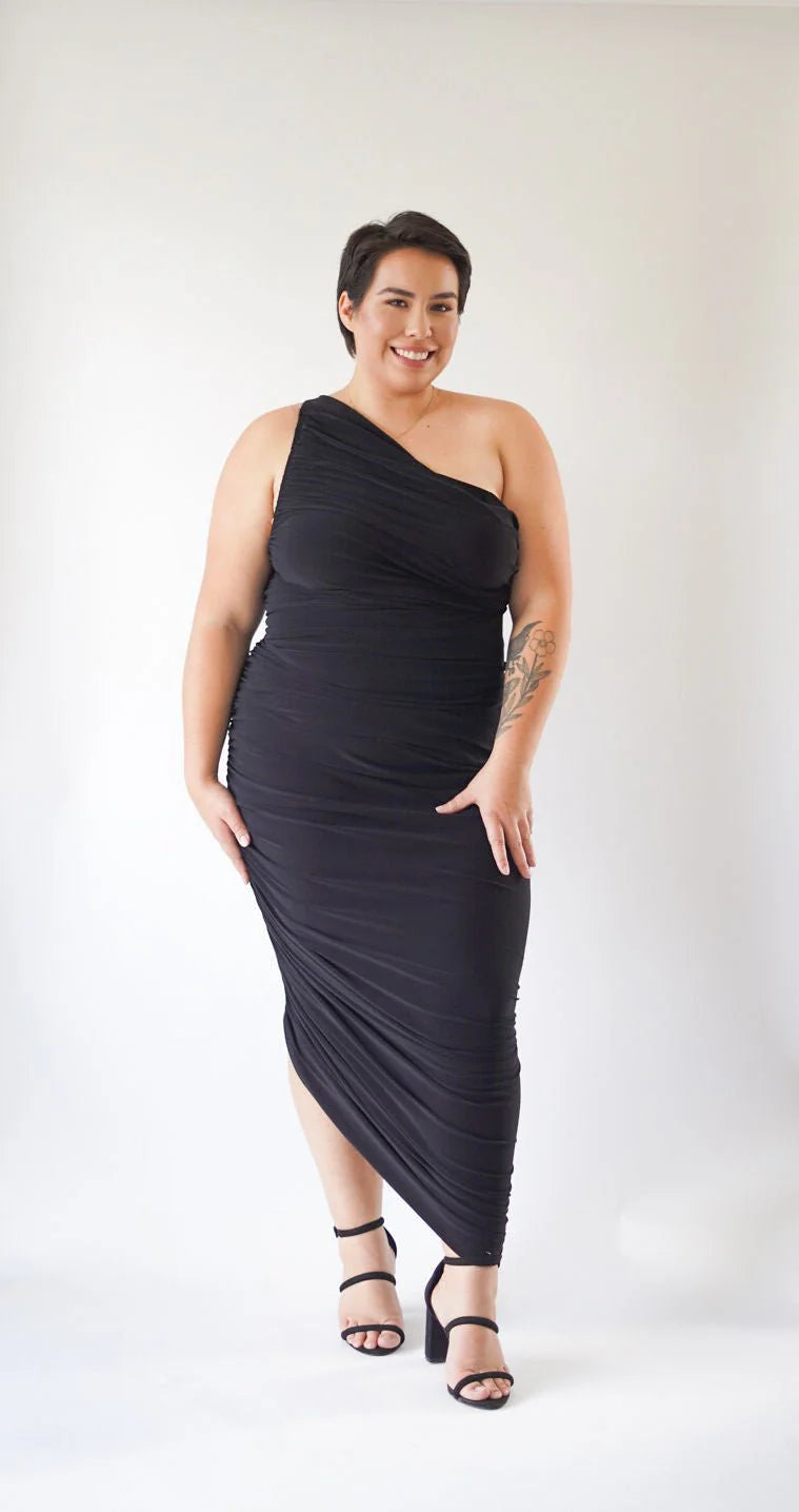 an asymmetrical hem. Comes with an in-built bodysuit.