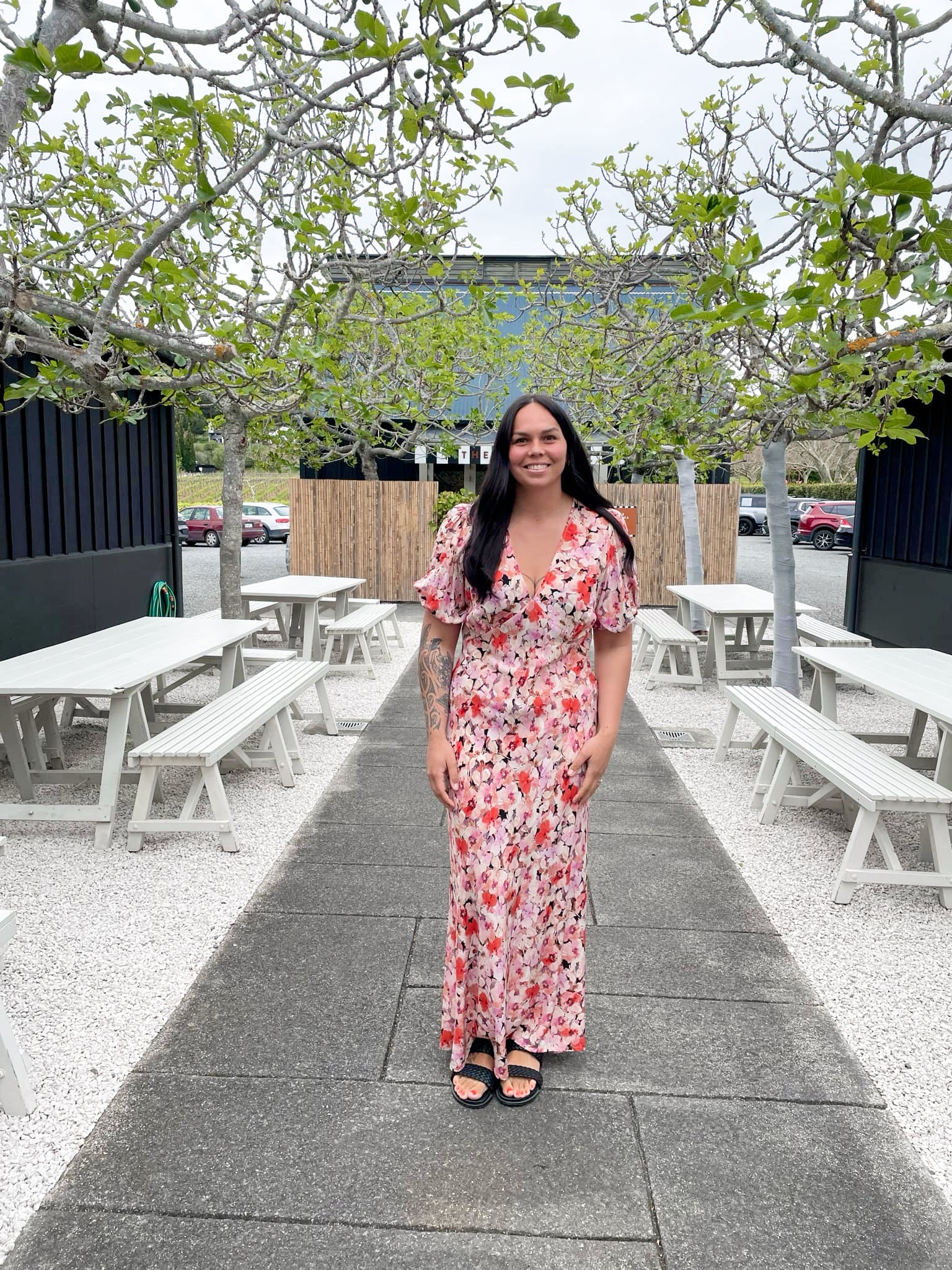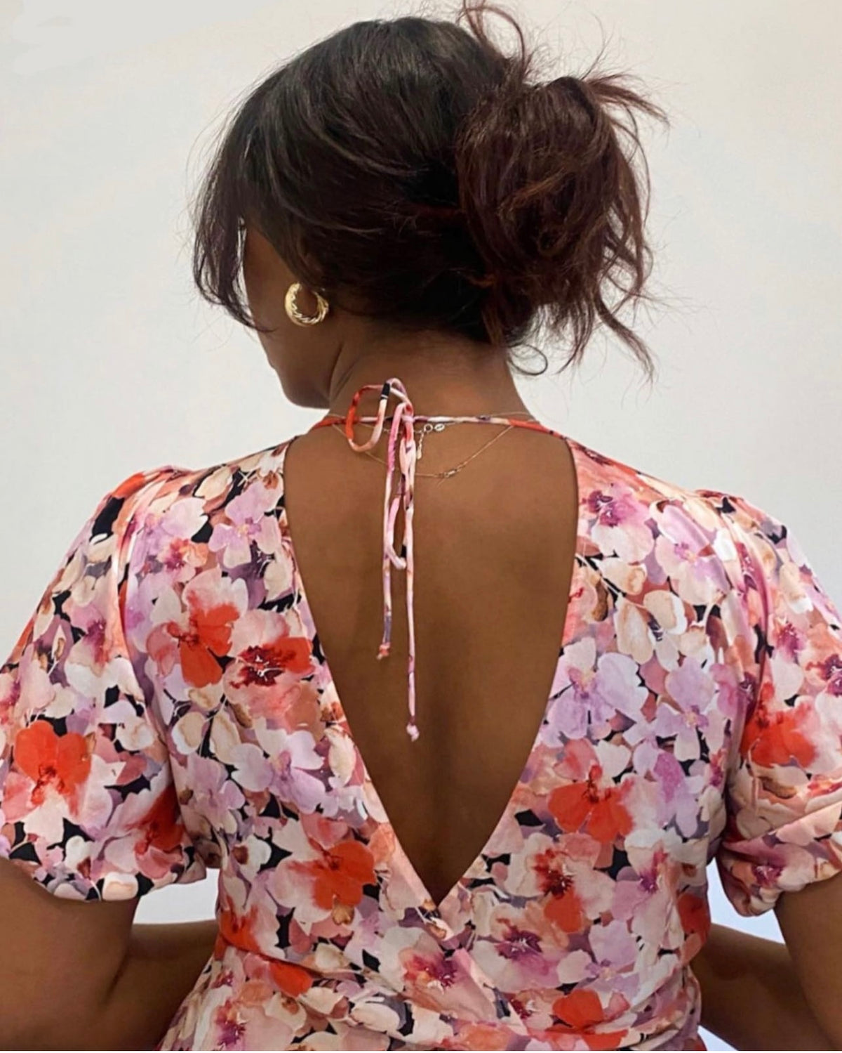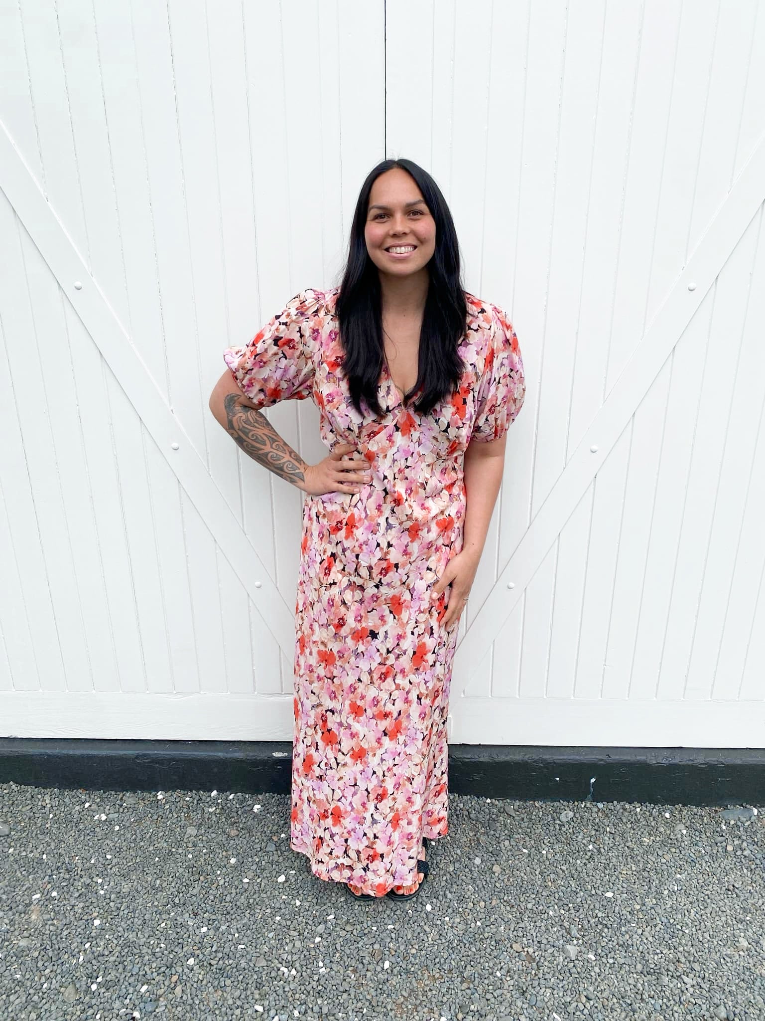 The Aimee Silk dress is a bias cut maxi dress. It features a front and back V-neck line and puff sleeve. This dress comes in the signature RUBY Pansy Print.