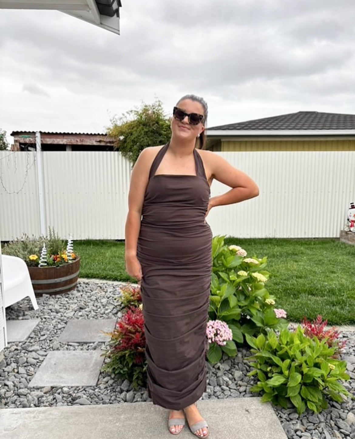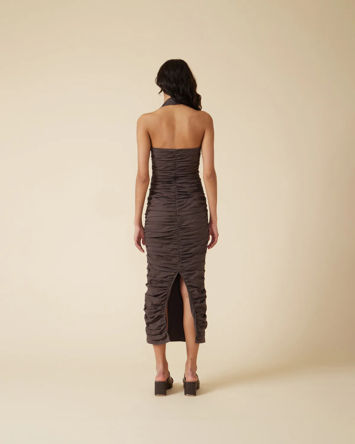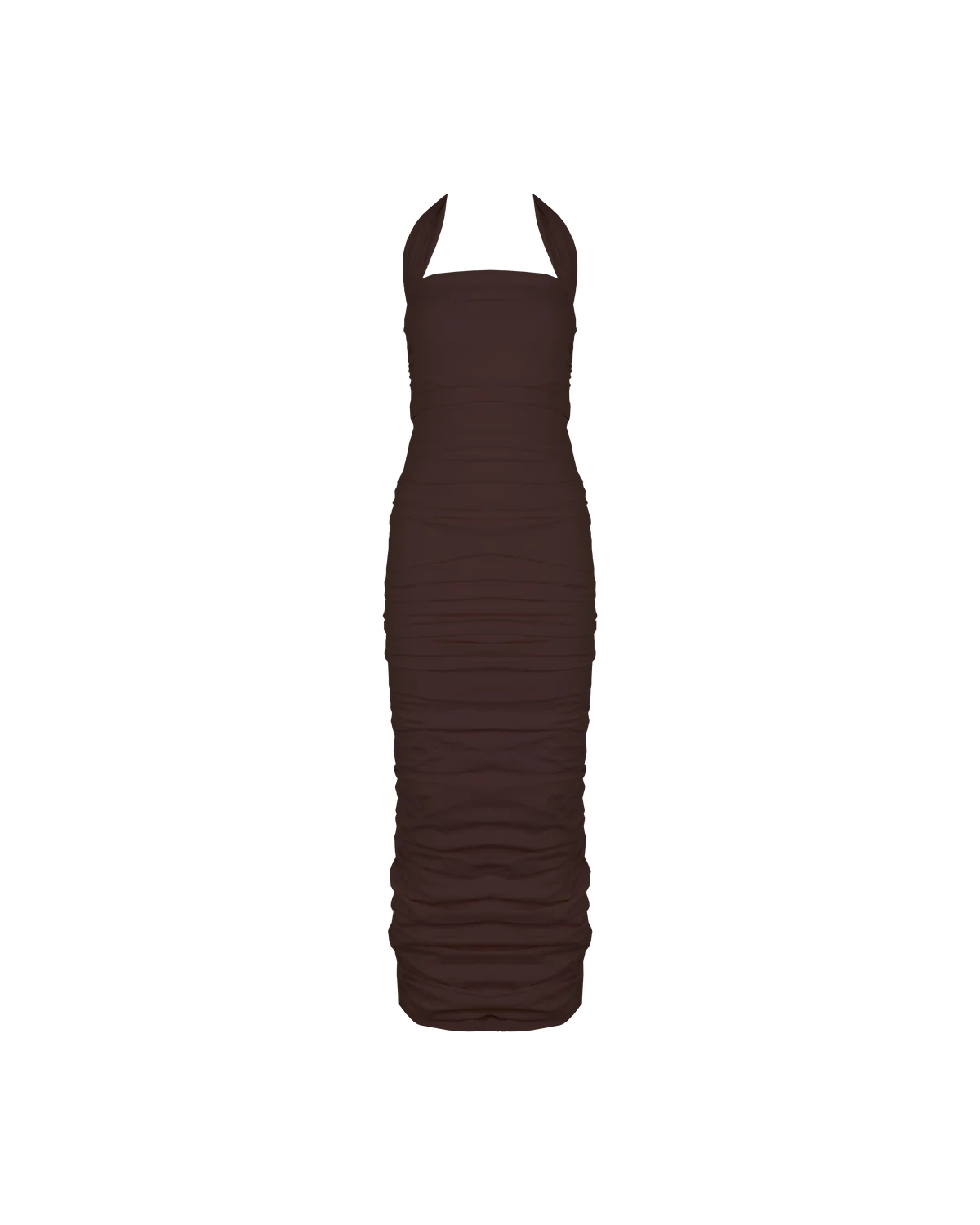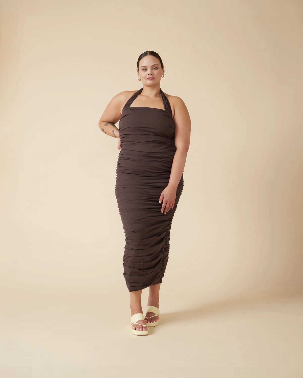 Crafted in a java coloured cotton, this dress features a halter neck and ruching down the side seams for a pleated look throughout.