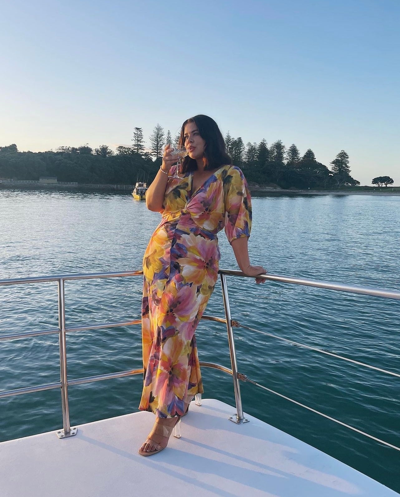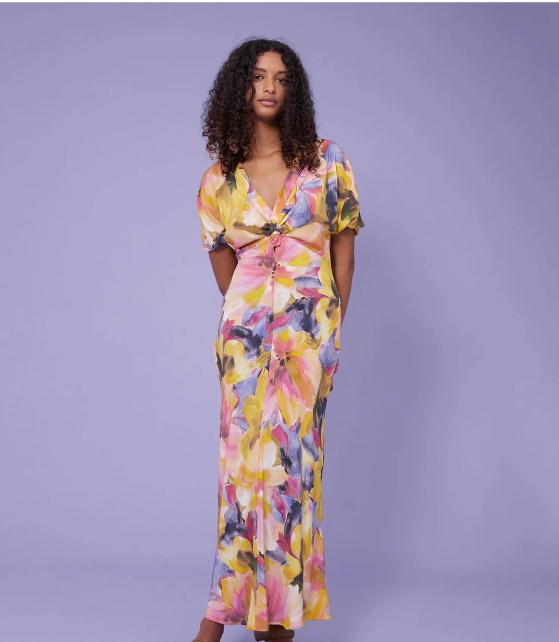 Bias cut midi dress with a twisted bodice forming a V-neckline and puff sleeve detail, in a RUBY exclusive Maude floral print. Seam detail under the bust, along with the bias silhouette of this piece ensure that this dress fits like a dream.