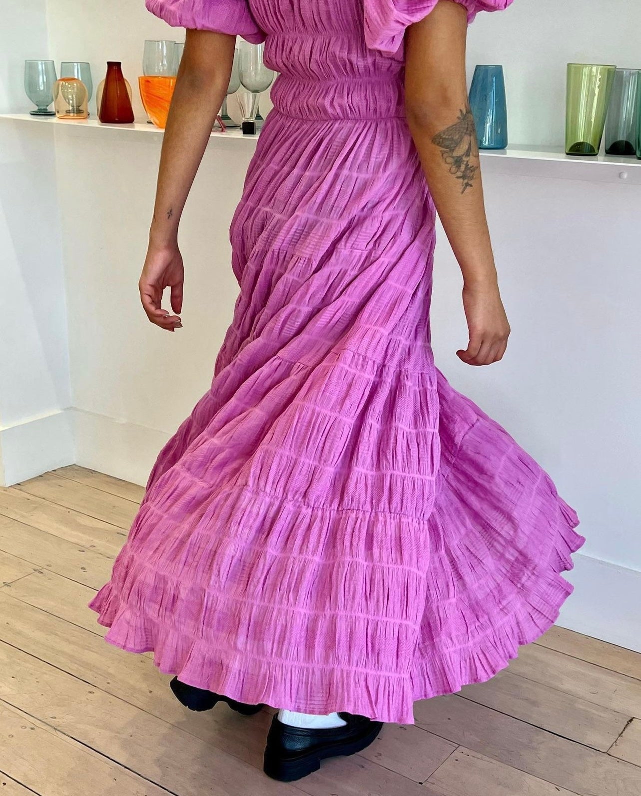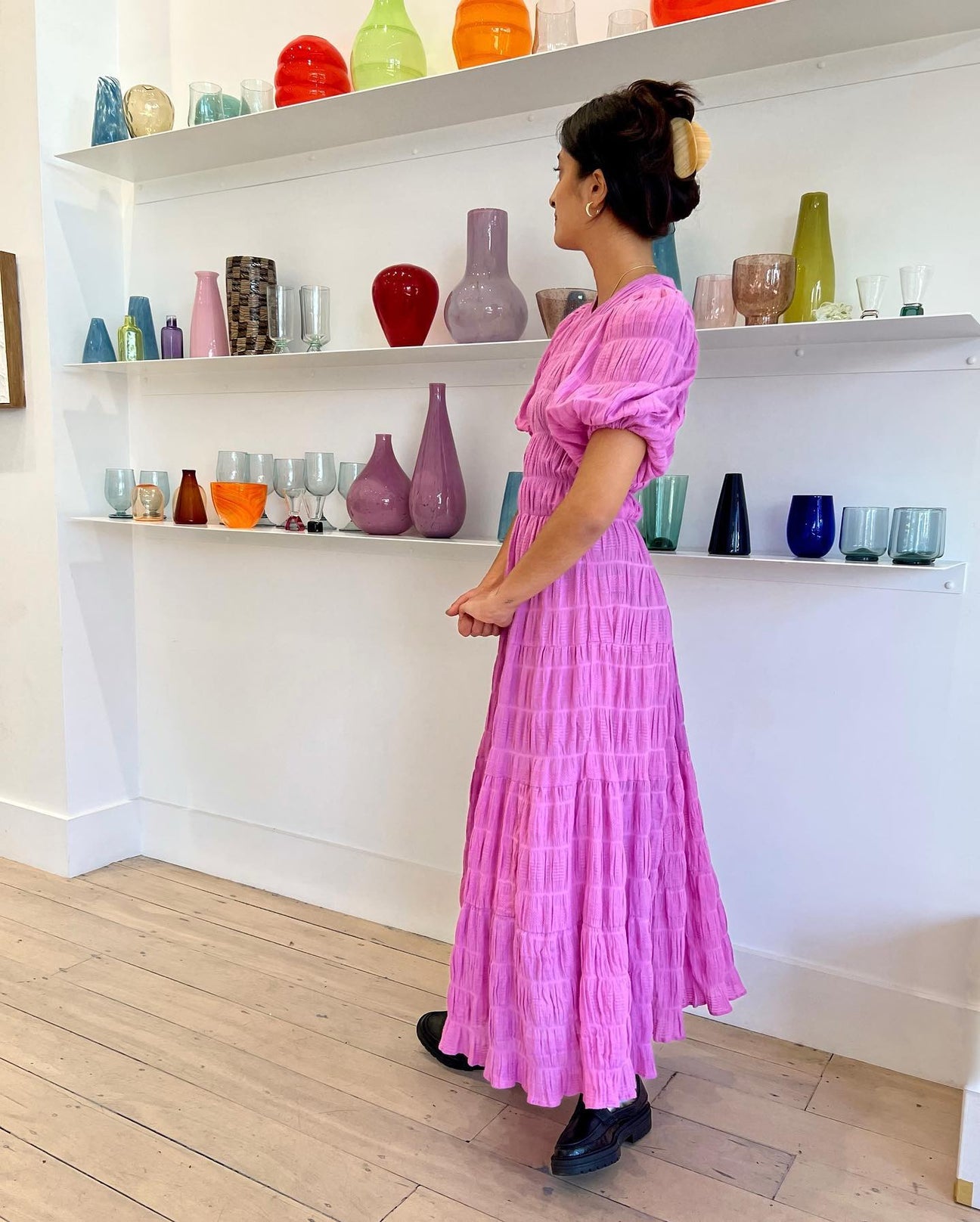 A-line maxi dress that is fitted through the top and continues into an floaty skirt, with a round neckline and short elasticated puff sleeves. The voluminous sleeves make this silhouette a stand out, crafted in signature RUBY Mirella fabric in a Orchid Pink