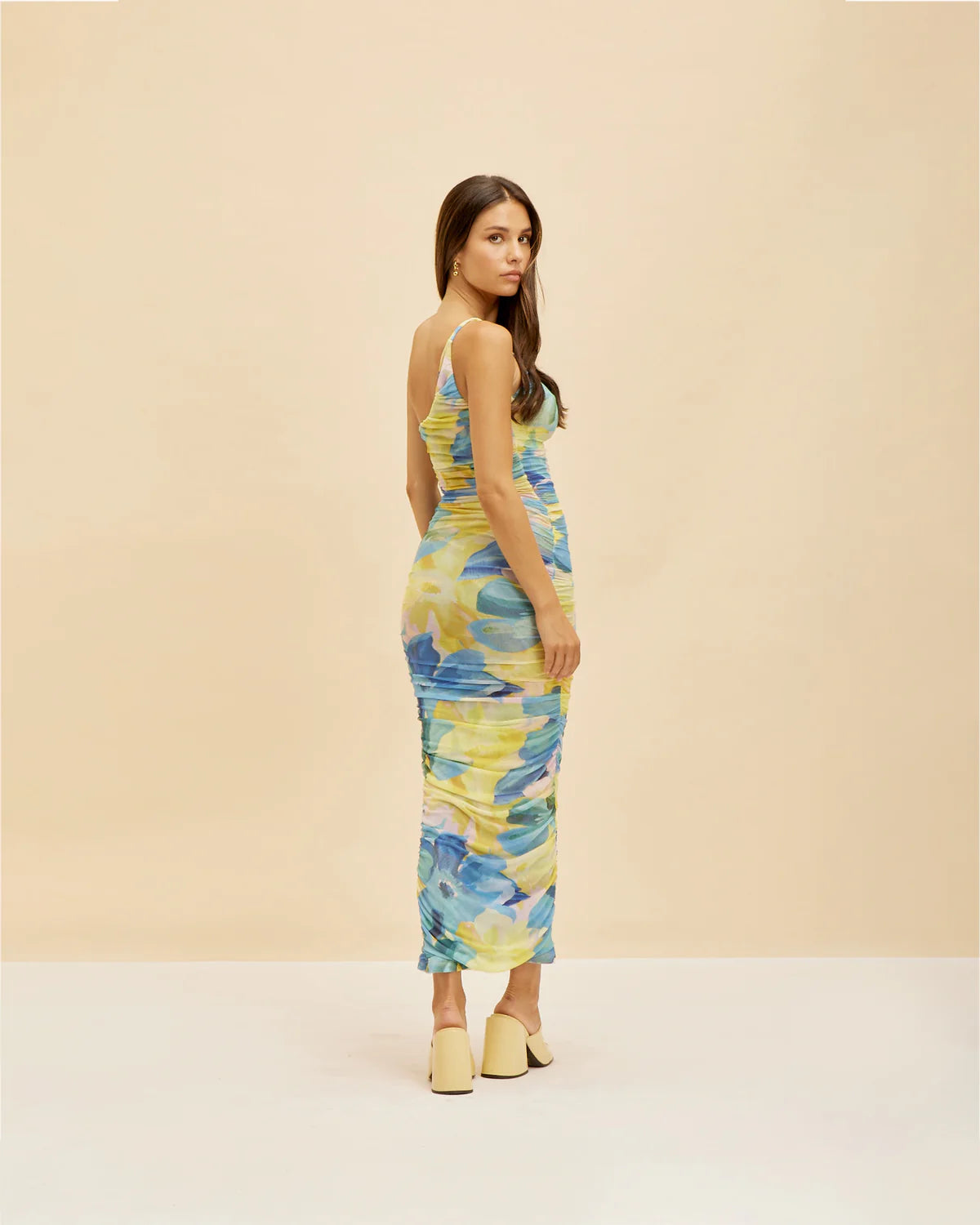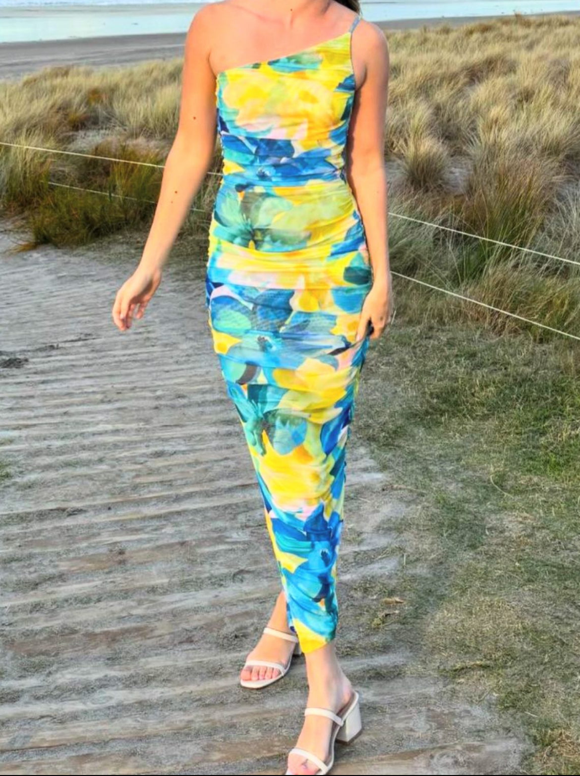 One shoulder mesh maxi dress in our buttercup floral print. Features ruching down both side seams to create texture and shape whilst making you look seriously good.